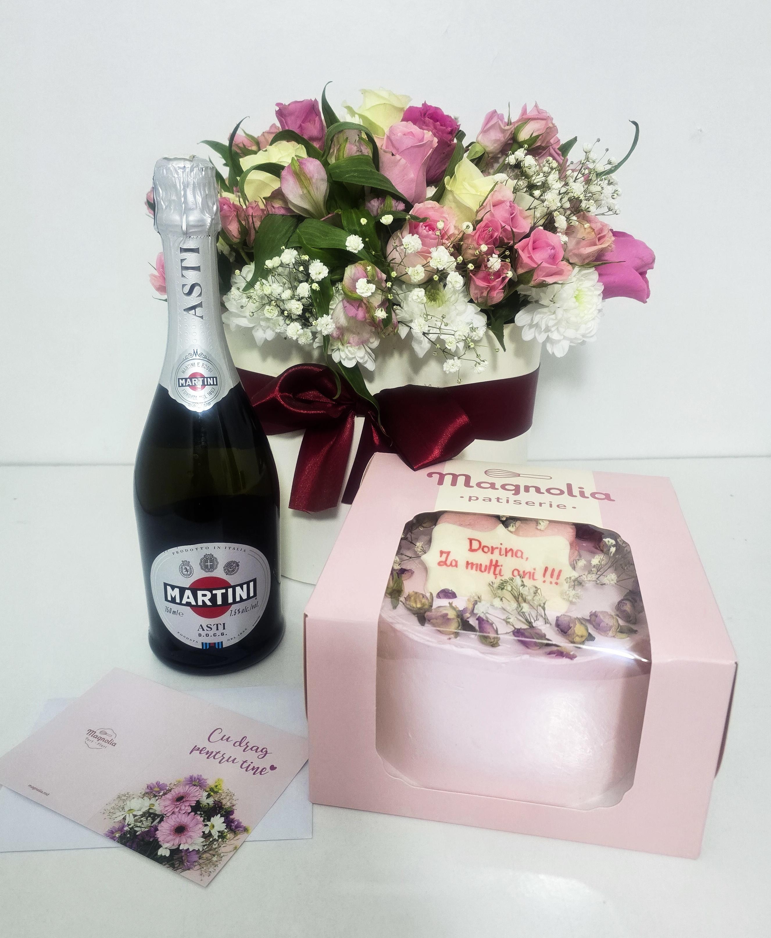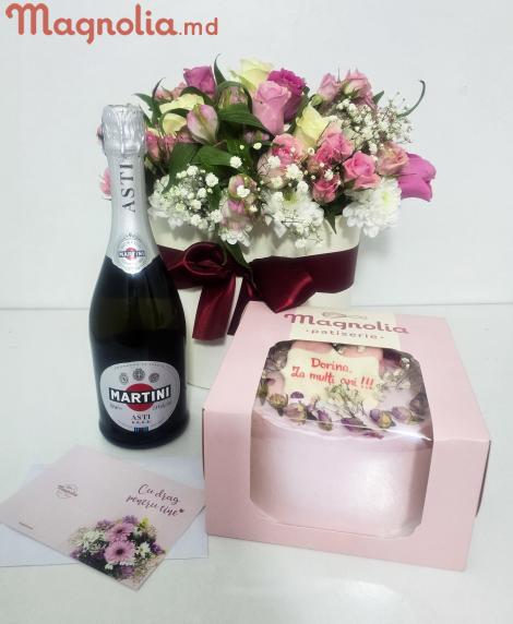 Set 22: Tort Tropic 900g,Cutie cu 15 Trandafiri și Flori de Sezon și Spumant | 1682 Lei